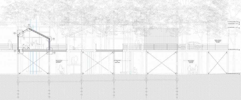 The preservation of the existing landscape is held with high regard and the positioning of the residential structure is meant to provide a home among the Willow trees. Underneath the table structure is a secured but open public space exhibiting the ‘Acrylic Columns’ of Robert Irwin--which similarly provides another opportunity to be within nature. A structural table supports the smaller, moment-framed structures above--enveloped with glass and standing-seam cladding. The structure as a whole is attached to the ground with helical pier foundations, is naturally ventilated, and includes radiant heating embedded within the concrete floors.